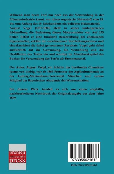 August Vogel (1817-1889) stellt in seiner umfangreichen Abhandlung die Bedeutung dieses Moorextraktes vor. Auf 175 Seiten liefert er eine fundierte Beschreibung der chemischen Eigenschaften, erklärt die verschiedenen Bearbeitungsweisen und charakterisiert die dabei gewonnenen Resultate. Vogel geht dabei ausführlich auf die Gewinnung, die Verkohlung und die Destillation des Torfes ein und würdigt im Abschlusskapitel des Buches die Verwendung des Torfes als Brennmaterial.