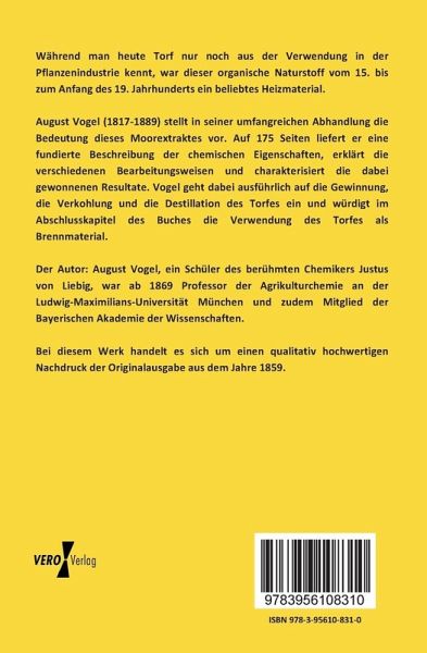 August Vogel (1817-1889) stellt in seiner umfangreichen Abhandlung die Bedeutung dieses Moorextraktes vor. Auf 175 Seiten liefert er eine fundierte Beschreibung der chemischen Eigenschaften, erklärt die verschiedenen Bearbeitungsweisen und charakterisiert die dabei gewonnenen Resultate. Vogel geht dabei ausführlich auf die Gewinnung, die Verkohlung und die Destillation des Torfes ein und würdigt im Abschlusskapitel des Buches die Verwendung des Torfes als Brennmaterial.