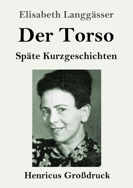 Elisabeth Langgässer: Der Torso. Späte KurzgeschichtenLesefreundlicher Großdruck in 16-pt-SchriftGroßformat, 210 x 297 mmBerliner Ausgabe, 2023Durchgesehener Neusatz bearbeitet und eingerichtet von Theodor BorkenErstdruck dieser Zusammenstellung unter dem Titel »Der Torso. Kurz-Geschichten«: Hamburg, Claassen und Goverts, 1947.Inhaltsverzeichnis:Der Torso.Ballade vom Menschen dieser Zeit.Der Torso.Das Stillleben.Saisonbeginn.Die Sippe auf dem Berg und im Tal.Verlagert.Untergetaucht.Lydia.Der Erstkommuniontag.Jetzt geht die Welt unter.Nichts Neues.Glück haben.Der Friede Gottes.Die getreue Antigone.Kuckuck.Vorlage auf Reisen.Hier war die Zeit vorbei.Im Einklang.Das gibt es.Fürchte Gott.Der Text dieser Ausgabe wurde behutsam an die neue deutsche Rechtschreibung angepasst.Umschlagabbildung: Elisabeth Langgässer, 1937Gesetzt aus der Minion Pro, 16 pt.Henricus - Edition Deutsche Klassik GmbH