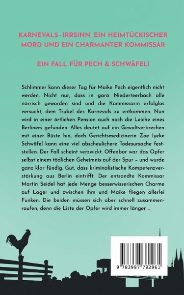 Karnevals-Irrsinn, ein heimtückischer Mord und ein charmanter Kommissar – ein Fall für Pech & Schwäfel! Teil zwei der Cosy Crime-Reihe nach dem Audible-Original jetzt auch als E-Book Schlimmer kann dieser Tag für Maike Pech eigentlich nicht werden. Nicht nur, dass in ganz Niederteerbach alle närrisch geworden sind und die Kommissarin erfolglos versucht, dem Trubel des Karnevals zu entkommen. Nun wird in einer örtlichen Pension auch noch die Leiche eines Berliners gefunden. Alles deutet auf ein Gewaltverbrechen mit einer Büste hin, doch Gerichtsmedizinerin Zoe Iyeke Schwäfel kann eine viel abscheulichere Todesursache feststellen. Der Fall scheint verzwickt. Offenbar war das Opfer selbst einem tödlichen Geheimnis auf der Spur – und wurde ganz klar fündig. Gut, dass kriminalistische Kompetenzverstärkung aus Berlin eintrifft. Der entsandte Kommissar Martin Seidel hat jede Menge besserwisserischen Charme auf Lager und zwischen ihm und Maike fliegen allerlei Funken. Die beiden müssen sich aber schnell zusammenraufen, denn die Liste der Opfer wird immer länger … Weitere Titel dieser Reihe Pech und Schwäfel (ISBN: 9783987780820) Erste Leser:innenstimmen „charmanter Cosy Crime, der einen einfach zum Schmunzeln bringt – klare Leseempfehlung!" „Auch den zweiten Band der Cosy Krimi-Reihe kann man durch den humorvollen Schreibstil, die erfrischenden Charaktere und den mysteriösen Mordfall kaum aus den Händen legen." „eine raffinierte Mischung aus Humor und Spannung." „ein spannender Mordfall mitten im Karnevalschaos – beste Krimiunterhaltung."