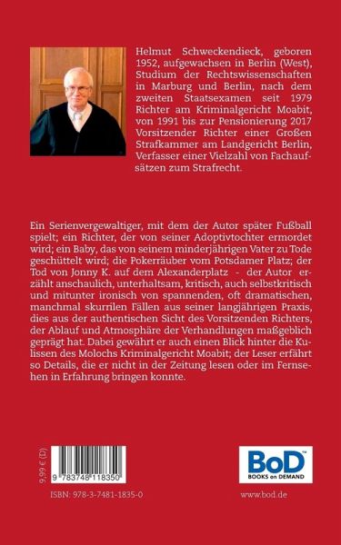 Ein Serienvergewaltiger, mit dem der Autor später Fußball spielt; ein Richter, der von seiner Adoptivtochter ermordet wird; ein Baby, das von seinem minderjährigen Vater zu Tode geschüttelt wird; die Pokerräuber vom Potsdamer Platz; der Tod von Jonny K. auf dem Alexanderplatz - der Autor erzählt anschaulich, unterhaltsam, kritisch, auch selbstkritisch und mitunter ironisch von spannenden, oft dramatischen, manchmal skurrilen Fällen aus seiner langjährigen Praxis, dies aus der authentischen Sicht des Vorsitzenden Richters, der Ablauf und Atmosphäre der Verhandlungen maßgeblich geprägt hat. Dabei gewährt er auch einen Blick hinter die Kulissen des Molochs Kriminalgericht Moabit; der Leser erfährt so Details, die er nicht in der Zeitung lesen oder im Fernsehen in Erfahrung bringen konnte.