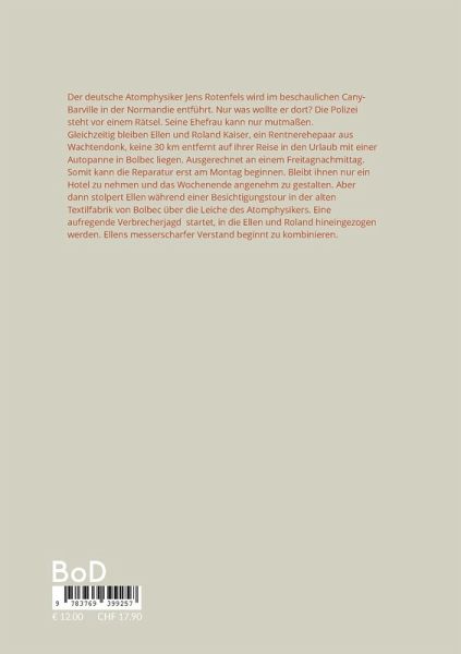 Der deutsche Atomphysiker Jens Rotenfels wird im beschaulichen Cany-Barville in der Normandie entführt. Nur was wollte er dort? Die Polizei steht vor einem Rätsel. Seine Ehefrau kann nur mutmaßen. Gleichzeitig bleiben Ellen und Roland Kaiser, ein Rentnerehepaar aus Wachtendonk, keine 30 km entfernt auf ihrer Reise in den Urlaub mit einer Autopanne in Bolbec liegen. An einem Freitagnachmittag. Somit kann die Reparatur erst am Montag beginnen. Bleibt ihnen nur, ein Hotel zu nehmen und das Wochenende angenehm zu gestalten. Aber dann stolpert Ellen während einer Besichtigungstour in der alten Textilfabrik von Bolbec über die Leiche des Atomphysikers. Eine aufregende Verbrecherjagd startet, in die Ellen und Roland hineingezogen werden. Ellens messerscharfer Verstand beginnt zu kombinieren.