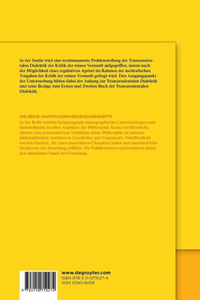 In der Arbeit wird eine textimmanente Problemstellung der Transzendentalen Dialektik der Kritik der reinen Vernunft aufgegriffen, indem ausgehend vom Grundsatz der Vernunft nach der Möglichkeit eines regulativen Apriori im Rahmen der methodischen Vorgaben der Kritik der reinen Vernunft gefragt wird. Kants regulativer Vernunftgebrauch wird in drei Teilen untersucht: Der erste Teil - Problemfeld - entwickelt ausgehend von der Antinomie der reinen Vernunft immanente Kriterien, durch die das Lehrstück des Anhangs zur Transzendentalen Dialektik dargestellt und geprüft werden kann. Der zweite Teil - Analysen - entwickelt textimmanent die Herleitung der Vernunftbegriffe, das dadurch geleistete Systematische der Erkenntnis und ihre transzendentale Rechtfertigung. Der dritte Teil - Dimension und Reichweite - untersucht auf der Basis der textimmanenten Analyse die konkreten Beispiele, die Kant im Anhang zur Transzendentalen Dialektik anführt, um damit die begrifflich-abstrakten Gedankengänge an Fallbeispielen zu konkretisieren. Der Grundsatz der Vernunft wird dabei in seiner konstitutiven Form zurückgewiesen und in einer regulativen Interpretation als transzendentaler Grundsatz der Vernunft neu begründet.