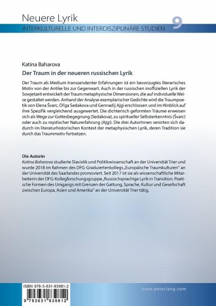 Der Traum als Medium transzendenter Erfahrungen ist ein bevorzugtes literarisches Motiv von der Antike bis zur Gegenwart. Auch in der russischen inoffiziellen Lyrik der Sowjetzeit entwickelt der Traum metaphysische Dimensionen, die auf individuelle Weise gestaltet werden. Anhand der Analyse exemplarischer Gedichte wird die Traumpoetik von Elena Svarc, Ol'ga Sedakova und Gennadij Ajgi erschlossen und im Hinblick auf ihre Spezifik vergleichend ausgewertet. Die dichterisch geformten Träume erweisen sich als Wege zur Gottesbegegnung (Sedakova), zu spiritueller Selbsterkenntnis (Svarc) oder auch zu mystischer Naturerfahrung (Ajgi). Die drei AutorInnen verorten sich dadurch im literaturhistorischen Kontext der metaphysischen Lyrik, deren Tradition sie durch das Traummotiv fortsetzen.