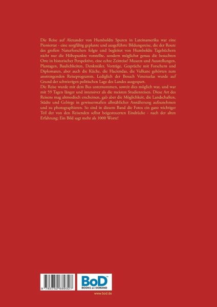 Die Reise auf Alexander von Humboldts Spuren in Lateinamerika war eine Pioniertat - eine sorgfältig geplante und ausgeführte Bildungsreise, die der Route des großen Naturforschers folgte und begleitet von Humboldts Tagebüchern nicht nur die Höhepunkte vorstellte, sondern möglichst genau die besuchten Orte in historischer Perspektive vorstellte, eine echte Zeitreise! Museen und Ausstellungen, Plantagen, Baulichkeiten, Denkmäler, Vorträge, Gespräche mit Forschern und Diplomaten, aber auch die Küche, die Haciendas, die Vulkane gehörten zum anstrengenden Reiseprogramm. Lediglich der Besuch Venezuelas wurde auf Grund der schwierigen politischen Lage des Landes ausgespart. Die Reise wurde mit dem Bus unternommen, soweit dies möglich war und war mit 59 Tagen länger und intensiver als die meisten Studienreisen. Diese Art des Reisens mag altmodisch erscheinen, gab aber die Möglichkeit, die Landschaften, Städte und Gebirge in gewissermaßen allmählicher Annäherung aufzunehmen und zu photographieren. So sind in diesem Band die Fotos ein ganz wichtiger Teil der von den Reisenden selbst beigesteuerten Eindrücke - nach der alten Erfahrung: Ein Bild sagt mehr als 1000 Wort!