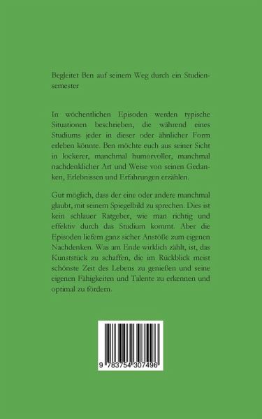 Begleitet Ben auf seinem Weg durch ein StudiensemesterIn wöchentlichen Episoden werden typische Situationen beschrieben, die während eines Studiums jeder in dieser oder ähnlicher Form erleben könnte. Ben möchte euch aus seiner Sicht in lockerer, manchmal humorvoller, manchmal nachdenklicher Art und Weise über seine Gedanken, Erlebnisse und Erfahrungen erzählen. Gut möglich, dass der eine oder andere manchmal glaubt, mit seinem Spiegelbild zu sprechen. Dies ist kein schlauer Ratgeber, wie man richtig und effektiv durch das Studium kommt. Aber die Episoden liefern ganz sicher Anstöße zum eigenen Nachdenken. Was am Ende wirklich zählt, ist, das Kunststück zu schaffen, die (im Rückblick meist) schönste Zeit des Lebens zu genießen und seine eigenen Fähigkeiten und Talente zu erkennen und optimal zu fördern.