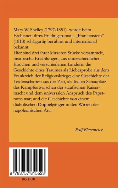 Hier sind drei kürzere Stücke Mary Shelleys versammelt, historische Erzählungen, aus unterschiedlichen Epochen und verschiedenen Ländern: die Geschichte eines Traumes als Liebesprobe aus dem Frankreich der Religionskriege; eine Geschichte der Leidenschaften aus der Zeit, als Italien Schauplatz des Kampfes zwischen der staufischen Kaisermacht und dem universalen Anspruch des Papsttums war; und die Geschichte von einem diabolischen Doppelgänger in den Wirren der napoleonischen Ära.