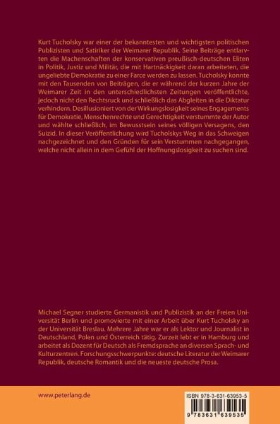 Kurt Tucholsky war einer der bekanntesten und wichtigsten politischen Publizisten und Satiriker der Weimarer Republik. Seine Beiträge entlarvten die Machenschaften der konservativen preußisch-deutschen Eliten in Politik, Justiz und Militär, die mit Hartnäckigkeit daran arbeiteten, die ungeliebte Demokratie zu einer Farce werden zu lassen. Tucholsky konnte mit den Tausenden von Beiträgen, die er während der kurzen Jahre der Weimarer Zeit in den unterschiedlichsten Zeitungen veröffentlichte, jedoch nicht den Rechtsruck und schließlich das Abgleiten in die Diktatur verhindern. Desillusioniert von der Wirkungslosigkeit seines Engagements für Demokratie, Menschenrechte und Gerechtigkeit verstummte der Autor und wählte schließlich, im Bewusstsein seines völligen Versagens, den Suizid. In dieser Veröffentlichung wird Tucholskys Weg in das Schweigen nachgezeichnet und den Gründen für sein Verstummen nachgegangen, welche nicht allein in dem Gefühl der Hoffnungslosigkeit zu suchen sind.