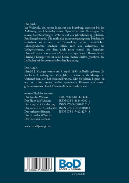 Jan Wolewski, ein junger Ingenieur aus Hamburg, entdeckt bei der Auflösung des Haushalts seines Opas rätselhafte Unterlagen. Bei seinen Nachforschungen stößt er auf ein jahrzehntelang gehütetes Familiengeheimnis. Die mühsam zusammengetragenen Fundstücke verändern nicht nur die Beurteilung seiner persönlichen Lebensgeschichte, sondern lüften auch ein Geheimnis des Weltgeschehens, von dem noch nicht einmal die damaligen Hauptakteure etwas wussten. Mit diesem ergreifenden Roman fesselt Harald J. Krueger seine Leser. Heitere Stellen gewähren das Luftholen bei der atemberaubenden Spannung.