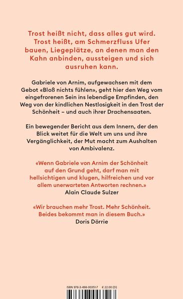 Der Trost der Schönheit ist eine schillernde Verbindung aus autobiografischem und essayistischem Erzählen: keine Kulturgeschichte, die ihren Gegenstand mit Theorie einhegen will, sondern eine literarische Spurensuche. Gabriele von Arnim fragt nach den Formen und Wirkungen dessen, was wir schön nennen; nach dem Glück und den dunklen Seiten der Empfindsamkeit. Die Suche führt zurück in die Kindheit, zu einem Mädchen aus kühl geführtem Haus, das erst lernen muss, zu fühlen, um Schönheit - einen tröstlichen Moment lang - in all ihrer endlichen Fülle wahrnehmen zu können.