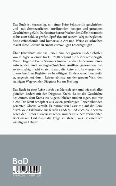 Über Jahrzehnte war das Reisen eine der großen Leidenschaften von Rüdiger Wiesner. Im Juli 2018 beginnt die bisher schwierigste Reise: Diagnose Krebs! So unerschrocken er die Hindernisse seiner aufregenden und außergewöhnlichen Ausflüge genommen hat, so zielstrebig macht er sich daran, die Reise mit, bzw. gegen den unerwünschten Begleiter zu bewältigen. Eindrucksvoll beschreibt er, angereichert durch Reiseerlebnisse aus der ganzen Welt, den steinigen Weg von der Diagnose bis zur Heilung.Das Buch ist eine Reise durch das Mensch sein und wie sich alles plötzlich ändert mit der Diagnose Krebs. Es ist die Geschichte des Autors, dem Krebs ins Auge zu blicken und zu sagen, mit mir nicht. Die Kraft schöpft er aus vielen großartigen Reisen über den gesamten Globus verteilt. Er nimmt den Leser mit auf die Reise durch viele Erlebnisse aus fernen Ländern und auch die Therapie gegen den Tumor als Reise zu sehen, immer aus einem veränderten Blickwinkel. Und dann die Frage zu stellen, was ist eigentlich wichtig im Leben?