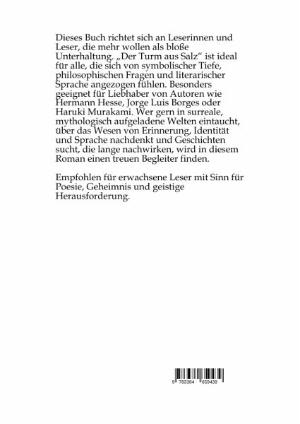 Der Turm aus Salz ist ein literarischer Abgrund und eine Himmelsleiter zugleich. In einer sterbenden Welt erhebt sich ein geheimnisvoller Turm, der nicht aus Stein, sondern aus Erinnerung, Sprache und verlorener Geschichte besteht. Die junge Ava begibt sich mit einer Gruppe schweigender Kinder auf eine Reise durch Zeit, Bewusstsein und das Vergessene. Kapitel für Kapitel enthüllt sich ein Netz aus Wahrheit, Mythos und Menschlichkeit. Was, wenn der Turm selbst ein lebendiges Wesen ist - und die letzte Hoffnung einer Welt, die sich selbst vergessen hat?