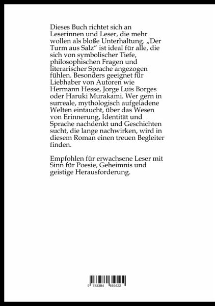 Der Turm aus Salz ist ein literarischer Abgrund und eine Himmelsleiter zugleich. In einer sterbenden Welt erhebt sich ein geheimnisvoller Turm, der nicht aus Stein, sondern aus Erinnerung, Sprache und verlorener Geschichte besteht. Die junge Ava begibt sich mit einer Gruppe schweigender Kinder auf eine Reise durch Zeit, Bewusstsein und das Vergessene. Kapitel für Kapitel enthüllt sich ein Netz aus Wahrheit, Mythos und Menschlichkeit. Was, wenn der Turm selbst ein lebendiges Wesen ist - und die letzte Hoffnung einer Welt, die sich selbst vergessen hat?