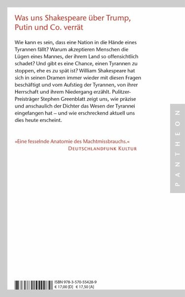 Wie kann es sein, dass eine Nation in die Hände eines Tyrannen fällt? Warum akzeptieren Menschen die Lügen eines Mannes, der ihrem Land so offensichtlich schadet? Und gibt es eine Chance, einen Tyrannen zu stoppen, ehe es zu spät ist? William Shakespeare hat sich in seinen Dramen immer wieder mit diesen Fragen beschäftigt und vom Aufstieg der Tyrannen, von ihrer Herrschaft und ihrem Niedergang erzählt. Pulitzer-Preisträger Stephen Greenblatt zeigt uns, wie präzise und anschaulich der Dichter das Wesen der Tyrannei eingefangen hat - und wie erschreckend aktuell uns dies heute erscheint.