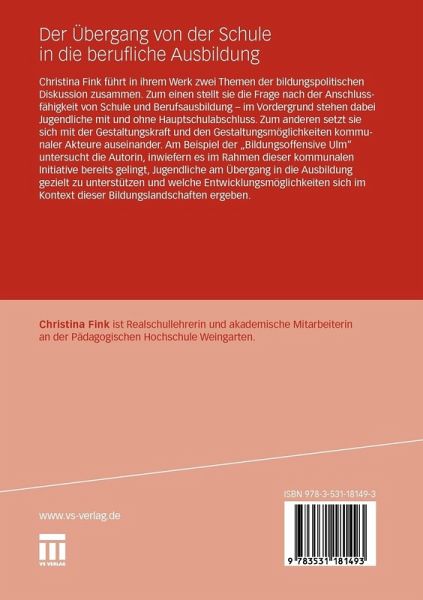 Christina Fink führt in ihrem Werk zwei Themen der bildungspolitischen Diskussion zusammen. Zum einen stellt sie die Frage nach der Anschlussfähigkeit von Schule und Berufsausbildung - im Vordergrund stehen dabei Jugendliche mit und ohne Hauptschulabschluss. Zum anderen setzt sie sich mit der Gestaltungskraft und den Gestaltungsmöglichkeiten kommunaler Akteure auseinander. Am Beispiel der "Bildungsoffensive Ulm" untersucht die Autorin, inwiefern es im Rahmen dieser kommunalen Initiative bereits gelingt, Jugendliche am Übergang in die Ausbildung gezielt zu unterstützen und welche Entwicklungsmöglichkeiten sich im Kontext dieser Bildungslandschaften ergeben.