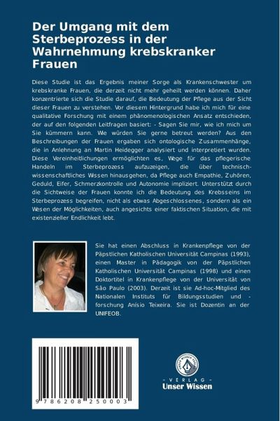 Diese Studie ist das Ergebnis meiner Sorge als Krankenschwester um krebskranke Frauen, die derzeit nicht mehr geheilt werden können. Daher konzentrierte sich die Studie darauf, die Bedeutung der Pflege aus der Sicht dieser Frauen zu verstehen. Vor diesem Hintergrund habe ich mich für eine qualitative Forschung mit einem phänomenologischen Ansatz entschieden, der auf den folgenden Leitfragen basiert: - Sagen Sie mir, wie ich mich um Sie kümmern kann. Wie würden Sie gerne betreut werden? Aus den Beschreibungen der Frauen ergaben sich ontologische Zusammenhänge, die in Anlehnung an Martin Heidegger analysiert und interpretiert wurden. Diese Vereinheitlichungen ermöglichten es, Wege für das pflegerische Handeln im Sterbeprozess aufzuzeigen, die über technisch-wissenschaftliches Wissen hinausgehen, da Pflege auch Empathie, Zuhören, Geduld, Eifer, Schmerzkontrolle und Autonomie impliziert. Unterstützt durch die Sichtweise der Frauen konnte ich die Bedeutung des Krebsseins im Sterbeprozess begreifen, nicht als etwas Abgeschlossenes, sondern als ein Wesen der Möglichkeiten, auch angesichts einer faktischen Situation, die mit existenzieller Endlichkeit lebt.