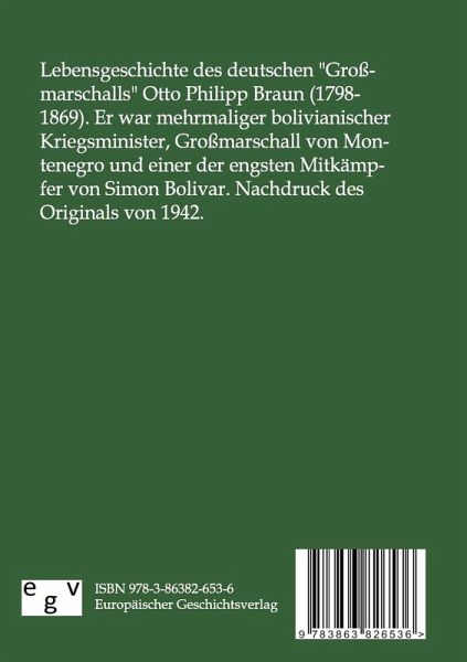 Lebensgeschichte des deutschen "Großmarschalls" Otto Philipp Braun (1798-1869). Er war mehrmaliger bolivianischer Kriegsminister, Großmarschall von Montenegro und einer der engsten Mitkämpfer von Simon Bolivar. Nachdruck des Originals von 1942.