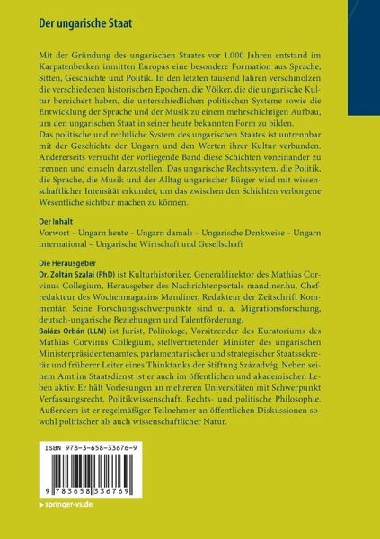 Mit der Gründung des ungarischen Staates vor 1.000 Jahren entstand im Karpatenbecken inmitten Europas eine besondere Formation aus Sprache, Sitten, Geschichte und Politik. In den letzten tausend Jahren verschmolzen die verschiedenen historischen Epochen, die Völker, die die ungarische Kultur bereichert haben, die unterschiedlichen politischen Systeme sowie die Entwicklung der Sprache und der Musik zu einem mehrschichtigen Aufbau, um den ungarischen Staat in seiner heute bekannten Form zu bilden. Das politische und rechtliche System des ungarischen Staates ist untrennbar mit der Geschichte der Ungarn und den Werten ihrer Kultur verbunden. Andererseits versucht der vorliegende Band diese Schichten voneinander zu trennen und einzeln darzustellen. Das ungarische Rechtssystem, die Politik, die Sprache, die Musik und der Alltag ungarischer Bürger wird mit wissenschaftlicher Intensität erkundet, um das zwischen den Schichten verborgene Wesentliche sichtbar machen zu können.
