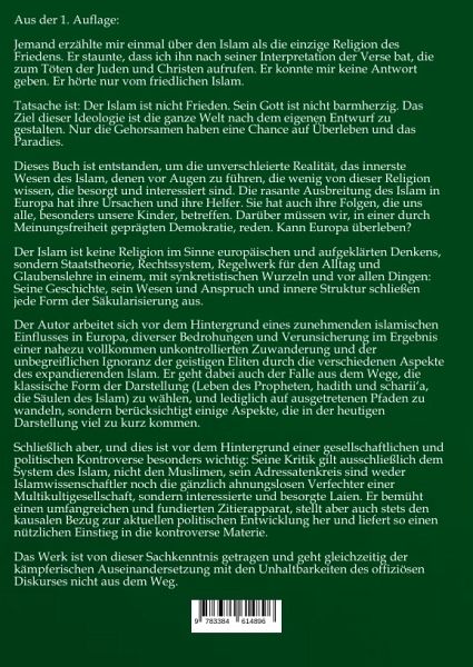 "Der Untergang Europas hat begonnen!" zeigt, welche Gefahr uns anstarrt: die Gefahr, die von den Anhängern der faschistischen, die Menschenwürde verachtenden Ideologie mit religiösem Hintergrund - ISLAM - (und gerade nicht "Islamismus") ausgeht, erobert zu werden!"Es geht um das nackte Überleben der europäischen Kultur ...wir stehen vor einer noch nie da gewesenen Gefahr für Europa!""Ob wir wollen oder nicht, jeder Westeuropäer ist heute gezwungen, sich mit dem Islam zu beschäftigen. Die Zukunft Europas als einer freiheitlich-demokratischen Gesellschaft, [...] wird wesentlich davon bestimmt, wie wir heute auf die Herausforderungen des Islam reagieren.""Der Islam ist keine normale Religion wie die anderen Religionen der Welt... der Islam ist revolutionärer Glaube, der eintritt, jede von Menschen geschaffene Staatsform zu zerstören""Wir Europäer verkaufen uns und unsere Kultur selbst. Vielen ist das egal. Hauptsache, sie bekommen ihr Bier und eine (verlogene) Zeitung mit der Wurstsemmel dazu und können vor dem nichtssagenden Programm einer (Regierungs-)Fernsehstation bis zum Einschlafen hocken. Denken als eine unzumutbar schwere Arbeit wird bei vielen, besonders den wohlstandsverwahrlosten Menschen, ausgeklammert. [...] Vieles davon ist von alltagsbedrängten Menschen nicht wahrnehmbar. Viele interessiert es nicht, bis sie selber betroffen werden. Und immer mehr sehen darin eine große Gefahr für den Frieden und die Freiheit in Europa und der Welt. [...] Hier nur einige Beispiele der freiwilligen Unterwerfung, einer falschen und gefährlichen Entwicklung im Namen der Toleranz." [Es folgen Beispiele wie: Verzicht auf Nikolaus-Feier, Singen von christlichen Liedern, Umbenennung "Weihnachtsmarkt" auf "Wintermarkt" etc,]"Der Großteil der Muslime will und wird sich nie in die westlichen Länder integrieren [Anm. Sich im Sozialsystem einfügen ´Ja´; die Weltanschauung der aufgeklärten Moderne annehmen ... Nie ... weil diese mit dem Islam UNVERTRÄGLICH sind! Das Christentum ... sehr wohl (siehe M.-K. Hartlage)!] und das muss die Politik endlich einmal begreifen. (...) Jeder halbwegs klar denkende Mensch sieht, dass die Integration fremd-behafteter Bevölkerung nicht funktioniert, weil der Islam nur ein, bereits besprochenes Ziel [Anm. die weltweite Herrschaft des Kalifats und Allah's Gesetzgebung] verfolgt!" "Die Zeit der Unschuld ist endgültig vorbei. Noch stehen die westlichen Zivilisationen dieser Entwicklung eher gelassen gegenüber und ignorieren den schleichend zunehmenden Einfluss des Halbmondes in Mitteleuropa und den islamischen Anspruch auf die Weltherrschaft, Sie Übersehen dabei die künftigen Auswirkungen auf ihre in Jahrhunderten gewachsene und seit dem Zeitalter der Aufklärung veränderte Kultur, Lebensweise und Weltsicht. [...] Die ungestörte Ausübung jedweder Religion, die Freiheit der Meinung und persönlichen Lebensgestaltung sind gefährdet, aber die gleichgültige Haltung so vieler Bürger auf dem europäischen Kontinent treibt den Prozess einer möglichen explosiven Entwicklung voran. Sie verhindert die friedliche Aufarbeitung des schwelenden Konfliktes und ein sinnvolles Gegensteuern zur rechten Zeit, bis es möglicherweise zu spät ist [...]" (Nach J. Feyerabend)Das Ziel dieses Buches ist klar; es möchte diese ganz konkrete Gefahr, die uns in naher Zukunft nicht nur droht, sondern schon real erlebbar ist, aufzeigen und warnen.