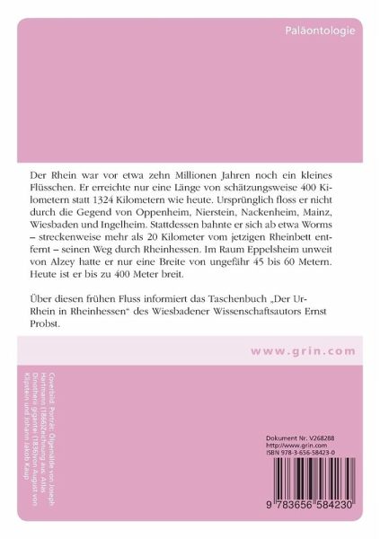 Fachbuch aus dem Jahr 2014 im Fachbereich Geowissenschaften / Geographie - Geologie, Mineralogie, Bodenkunde, , Sprache: Deutsch, Abstract: Der Rhein war vor etwa zehn Millionen Jahren noch ein kleines Flüsschen. Er erreichte nur eine Länge von schätzungsweise 400 Kilometern statt 1324 Kilometern wie heute. Ursprünglich floss er nicht durch die Gegend von Oppenheim, Nierstein, Nackenheim, Mainz, Wiesbaden und Ingelheim. Stattdessen bahnte er sich ab etwa Worms - streckenweise mehr als 20 Kilometer vom jetzigen Rheinbett entfernt - seinen Weg durch Rheinhessen. Im Raum Eppelsheim unweit von Alzey hatte er nur eine Breite von ungefähr 45 bis 60 Metern. Heute ist er bis zu 400 Meter breit.Über diesen frühen Fluss informiert das Taschenbuch "Der Ur-Rhein in Rheinhessen" des Wiesbadener Wissenschaftsautors Ernst Probst. Gewidmet ist es dem Paläontologen Dr. Jens Lorenz Franzen in Titisee-Neustadt, Altbürgermeister Heiner Roos in Eppelsheim und der Bürgermeisterin Ute Klenk-Kaufmann inEppelsheim, die sich - jeder auf seine Weise - um die Erforschung der Tierwelt am Ur-Rhein und um den Aufbau des "Dinotherium-Museums" in Eppelsheim verdient gemacht haben.Am Ur-Rhein existierte eine exotische Tierwelt, wie man vor allem durch Funde bei Eppelsheim, am Wissberg bei Gau-Weinheim und bei Dorn-Dürkheim weiß. In der Gegend von Eppelsheim etwa lebten Rüsseltiere, Säbelzahnkatzen, Bärenhunde, Tapire, Nashörner, krallenfüßige Huftiere, Ur-Pferde und sogar Menschenaffen. Eppelsheim genießt weltweit in der Wissenschaft einen guten Ruf. Zusammen mit dem Pariser Montmartre gehört der kleine Ort südlich von Alzey zu jenen großartigen Fossillagerstätten, mit denen die Erforschung ausgestorbener Säugetiere in Europa begonnen hat.Zum Gelingen dieses Taschenbuches haben Altbürgermeister Heiner Roos, Bürgermeisterin Ute Klenk-Kaufmann, der Förderverein Dinotherium-Museum Eppelsheim, die GemeindeEppelsheim, Dr. Jens Lorenz Franzen, Dr. Jens Sommer, Dr. Gerhard Storch, Dr. Frank Holzförster, Professor Dr. Wolfgang Schirmer, Dr. Winfried Kuhn, Dr. Ursula Bettina Göhlich, Mag. Thomas Bence Viola, Dr. Oliver Sandrock, Dr. Thomas Keller und Thomas Engel beigetragen.Das Taschenbuch "Der Ur-Rhein in Rheinhessen" enthält ein Gemälde und zahlreiche Zeichnungen von Tieren aus den Dinotheriensanden bei Eppelsheim in Rheinhessen. Diese Bilder wurden im Auftrag der Gemeinde Eppelsheim und des Fördervereins Dinotherium-Museum Eppelsheim von dem akademischen Maler Pavel Major aus Prag angefertigt und mit freundlicher Genehmigung im vorliegenden Taschenbuch veröffentlicht.