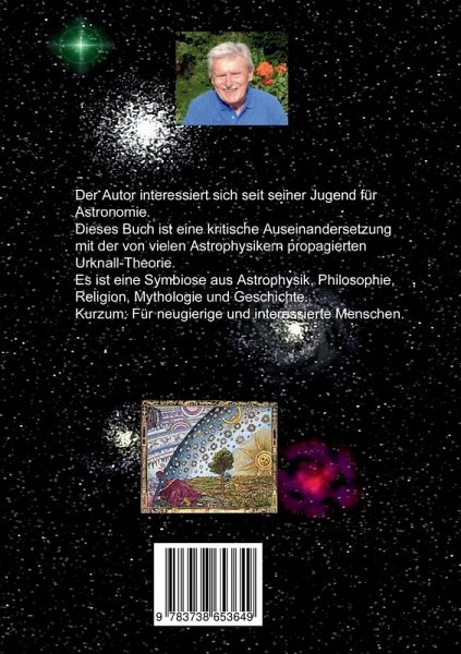 Der Autor beschäftigt sich schon seit seiner Jugend mit Astronomie. Dieses Buch ist eine Entgegnung gegenüber der von den Astrophysikern verbreiteten Theorie vom Urknall als dem Beginn dieses Universums.Es ist eine Symbiose aus Astrophysik, Philosophie, Religion, Mythologie und Geschichte. Kurzum: Interessant für neugierige und kritische Leser.