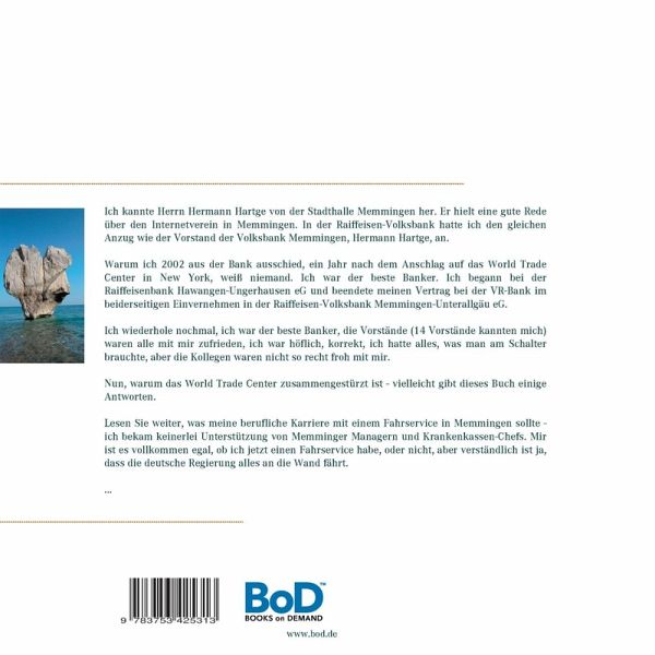 Ich kannte Herrn Hermann Hartge von der Stadthalle Memmingen her. Er hielt eine gute Rede über den Internetverein in Memmingen. In der Raiffeisen-Volksbank hatte ich den gleichen Anzug wie der Vorstand der Volksbank Memmingen, Hermann Hartge, an. Warum ich 2002 aus der Bank ausschied, ein Jahr nach dem Anschlag auf das World Trade Center in New York, weiß niemand. Ich war der beste Banker. Ich begann bei der Raiffeisenbank Hawangen-Ungerhausen eG und beendete meinen Vertrag bei der VR-Bank im beiderseitigen Einvernehmen in der Raiffeisen-Volksbank Memmingen-Unterallgäu eGIch wiederhole nochmal, ich war der beste Banker, die Vorstände (14 Vorstände kannten mich) waren alle mit mir zufrieden, ich war höflich, korrekt, ich hatte alles, was man am Schalter brauchte, aber die Kollegen waren nicht so recht froh mit mir.Nun, warum das World Trade Center zusammengestürzt ist - vielleicht gibt dieses Buch einige Antworten.Lesen Sie weiter, was meine berufliche Karriere als Fahrservice in Memmingen sollte - ich bekam keinerlei Unterstützung von Memminger Managern und Krankenkassen-Chefs. Mir ist es vollkommen egal ob ich jetzt einen Fahrservice habe, oder nicht, aber verständlich ist ja, dass die deutsche Regierung alles an die Wand fährt....