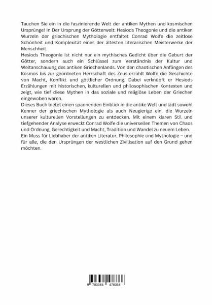 Tauchen Sie ein in die faszinierende Welt der antiken Mythen und kosmischen Ursprünge! In Der Ursprung der Götterwelt: Hesiods Theogonie und die antiken Wurzeln der griechischen Mythologie entfaltet Conrad Wolfe die zeitlose Schönheit und Komplexität eines der ältesten literarischen Meisterwerke der Menschheit.Hesiods Theogonie ist nicht nur ein mythisches Gedicht über die Geburt der Götter, sondern auch ein Schlüssel zum Verständnis der Kultur und Weltanschauung des antiken Griechenlands. Von den chaotischen Anfängen des Kosmos bis zur geordneten Herrschaft des Zeus erzählt Wolfe die Geschichte von Macht, Konflikt und göttlicher Ordnung. Dabei verknüpft er Hesiods Erzählungen mit historischen, kulturellen und philosophischen Kontexten und zeigt, wie tief diese Mythen in das soziale und religiöse Leben der Griechen eingewoben waren.Dieses Buch bietet einen spannenden Einblick in die antike Welt und lädt sowohl Kenner der griechischen Mythologie als auch Neugierige ein, die Wurzeln unserer kulturellen Vorstellungen zu entdecken. Mit einem klaren Stil und tiefgehender Analyse erweckt Conrad Wolfe die universellen Themen von Chaos und Ordnung, Gerechtigkeit und Macht, Tradition und Wandel zu neuem Leben.Ein Muss für Liebhaber der antiken Literatur, Philosophie und Mythologie - und für alle, die den Ursprüngen der westlichen Zivilisation auf den Grund gehen möchten.