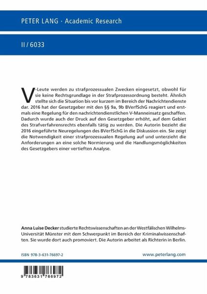 V-Leute werden zu strafprozessualen Zwecken eingesetzt, obwohl für sie keine Rechtsgrundlage in der Strafprozessordnung besteht. Ähnlich stellte sich die Situation bis vor kurzem im Bereich der Nachrichtendienste dar. 2016 hat der Gesetzgeber mit den §§ 9a, 9b BVerfSchG reagiert und erstmals eine Regelung für den nachrichtendienstlichen V-Manneinsatz geschaffen. Dadurch wurde auch der Druck auf den Gesetzgeber erhöht, auf dem Gebiet des Strafverfahrensrechts ebenfalls tätig zu werden. Die Autorin bezieht die 2016 eingeführte Neuregelungen des BVerfSchG in die Diskussion ein. Sie zeigt die Notwendigkeit einer strafprozessualen Regelung auf und unterzieht die Anforderungen an eine solche Normierung und die Handlungsmöglichkeiten des Gesetzgebers einer vertieften Analyse.