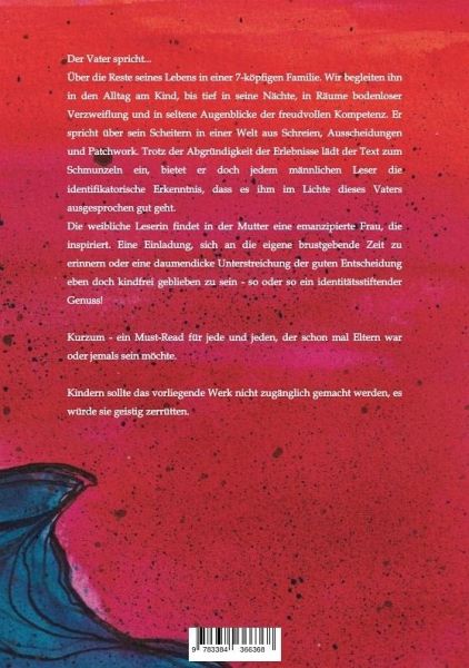 Der Vater spricht über Reste seines Lebens in einer 7-köpfigen Familie. Wir begleiten ihn in den Alltag am Kind, bis tief in seine Nächte, in Räume bodenloser Verzweiflung und in seltene Augenblicke freudvoller Kompetenz. In 20 Geschichten spricht er über sein Scheitern in einer Welt aus Schreien, Ausscheidungen und Patchwork. Ein Must-Read für jede und jeden, der schon mal Eltern war, es jemals sein möchte oder diejenigen, die gute Gründe suchen für immer kindfrei zu bleiben.
