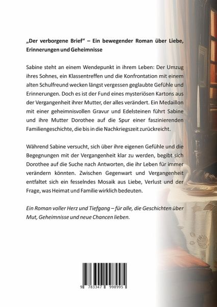 "Der verborgene Brief" - Ein bewegender Roman über Liebe, Erinnerungen und Geheimnisse. Sabine steht an einem Wendepunkt in ihrem Leben: Der Umzug ihres Sohnes, ein Klassentreffen und die Konfrontation mit einem alten Schulfreund wecken längst vergessen geglaubte Gefühle und Erinnerungen. Doch es ist der Fund eines mysteriösen Kartons aus der Vergangenheit ihrer Mutter, der alles verändert. Ein Medaillon mit einer geheimnisvollen Gravur und Edelsteinen führt Sabine und ihre Mutter Dorothee auf die Spur einer faszinierenden Familiengeschichte, die bis in die Nachkriegszeit zurückreicht. Während Sabine versucht, sich über ihre eigenen Gefühle und die Begegnungen mit der Vergangenheit klar zu werden, begibt sich Dorothee auf die Suche nach Antworten, die ihr Leben für immer verändern könnten. Zwischen Gegenwart und Vergangenheit entfaltet sich ein fesselndes Mosaik aus Liebe, Verlust und der Frage, was Heimat und Familie wirklich bedeuten. Ein Roman voller Herz und Tiefgang - für alle, die Geschichten über Mut, Geheimnisse und neue Chancen lieben.
