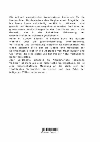 Die Ankunft europäischer Kolonisatoren bedeutete für die Ureinwohner Nordamerikas den Beginn einer Tragödie, die bis heute kaum vollständig erzählt ist. Während Land geraubt und Ressourcen ausgebeutet wurden, fand eine der grausamsten Auslöschungen in der Geschichte statt - ein Genozid, der in der kollektiven Erinnerung der Gesellschaften im Schatten geblieben ist.Peter F. Cooper enthüllt in diesem Buch die düstere Wahrheit über die jahrhundertelange Unterdrückung, Vertreibung und Vernichtung indigener Gemeinschaften. Mit einem scharfen Blick auf die Motive und Methoden der Kolonialmächte legt er die Abgründe von Machthunger und Gier offen, die eine stolze und tief mit der Natur verbundene Kultur zerstörten."Der verdrängte Genozid an Nordamerikas indigenen Völkern" ist mehr als eine historische Untersuchung. Es ist eine leidenschaftliche Mahnung an die Welt, sich der verdrängten Verbrechen zu stellen und das Erbe der indigenen Völker zu bewahren.