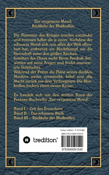 Die Flammen des Krieges wurden entzündet und brennen heller als je zuvor. Nachdem der schwarze Mond sich nun offen der Welt offenbart hat, entbrennt ein Machtkampf um die Herrschaft unter den großen Reichen. Inmitten des Chaos sucht Herm Pendrak Antworten auf seine Fragen und findet unerwartete Verbündete. Während der Prätor die Pläne seines dunklen Meisters weiter vorantreibt, kehrt eine alte Macht zurück aus dem Verborgenen. Die Blutkrallen fordern einen neuen Kaiser.