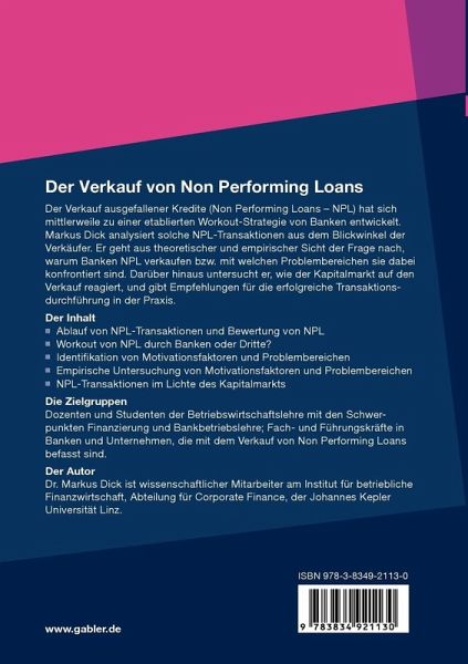 Der Verkauf ausgefallener Kredite (Non Performing Loans - NPL) hat sich mittlerweile zu einer etablierten Workout-Strategie von Banken entwickelt. Markus Dick analysiert solche NPL-Transaktionen aus dem Blickwinkel der Verkäufer. Er geht aus theoretischer und empirischer Sicht der Frage nach, warum Banken NPL verkaufen bzw. mit welchen Problembereichen sie dabei konfrontiert sind. Darüber hinaus untersucht er, wie der Kapitalmarkt auf den Verkauf reagiert, und gibt Empfehlungen für die erfolgreiche Transaktionsdurchführung in der Praxis.