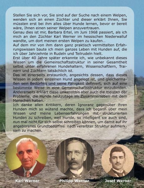 Stellen Sie sich vor, Sie sind auf der Suche nach einem Welpen,wenden sich an einen Züchter und dieser erklärt Ihnen, Siemüssten erst bei ihm alles über Hunde lernen, bevor er bereitwäre, Ihnen einen seiner Welpen anzuvertrauen.Genau dies ist mir, Barbara Ertel, im Juni 1968 passiert, als ichmich an den Züchter Karl Werner im hessischen Niederwallufwandte, um dort meinen ersten Welpen zu kaufen...Auf dem mir von ihm dann ganz praktisch vermittelten Erfahrungswissenbaute ich mein ganzes Leben mit Hunden auf, dieich über Jahrzehnte in Rudeln und Teilrudeln hielt.Erst über 40 Jahre später erkannte ich, wie unbekannt diesesWissen um die Gemeinschaftsstruktur in seiner Gesamtheitselbst unter erfahrenen Hundehaltern, Wissenschaftlern, Trainernund Züchtern tatsächlich ist.Das ist einerseits erstaunlich, angesichts dessen, dass diesesWissen in jedem einzelnen Hund angelegt ist, und gleichermaßensein Bedürfnis und seine Fähigkeit definiert, sich auf einebestimmte Weise in eine Gemeinschaftsstruktur einzubinden.Andererseits erklärt diese Unkenntnis aber auch die meisten derProbleme, die Hunde heutzutage im Zusammenleben mit demMenschen haben.Ich danke allen Kritikern, deren Ignoranz gegenüber ihrenHunden mich so wütend machte, dass ich begann über meinWissen und meine Lebenserfahrungen mit strukturiertenHunden zu schreiben, weil Hunde, so intelligent sie auch sind,nun mal nicht für sich selbst schreiben können, um damit auf ihrangeborenes Grundbedürfnis nach vererbter Struktur aufmerksam zu machen.