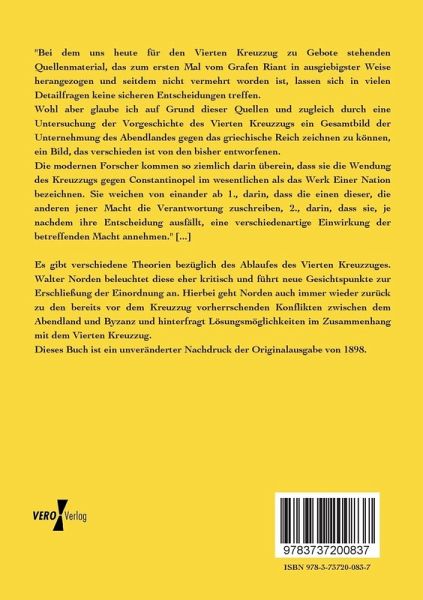 Es gibt verschiedene Theorien bezüglich des Ablaufes des Vierten Kreuzzuges. Walter Norden beleuchtet diese eher kritisch und führt neue Gesichtspunkte zur Erschließung der Einordnung an. Hierbei geht Norden auch immer wieder zurück zu den bereits vor dem Kreuzzug vorherrschenden Konflikten zwischen dem Abendland und Byzanz und hinterfragt Lösungsmöglichkeiten im Zusammenhang mit dem Vierten Kreuzzug.