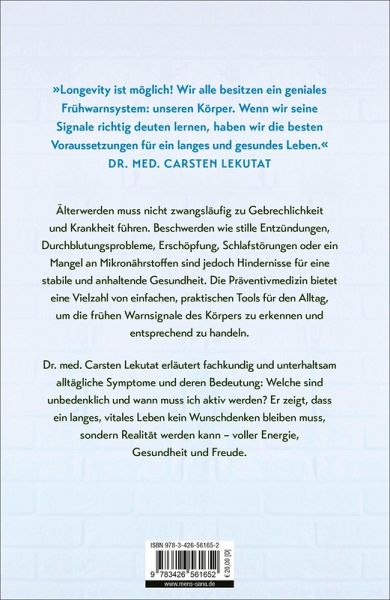 Dr. Carsten Lekutat erläutert fachkundig und unterhaltsam, auf was wir z. B. bei der Ernährung, beim Umgang mit Stress oder unseren Schlafgewohnheiten achten müssen. Ebenso benennt er die entscheidenden präventivmedizinischen Vorsorgeuntersuchungen, die jeder von uns in Betracht ziehen sollte.