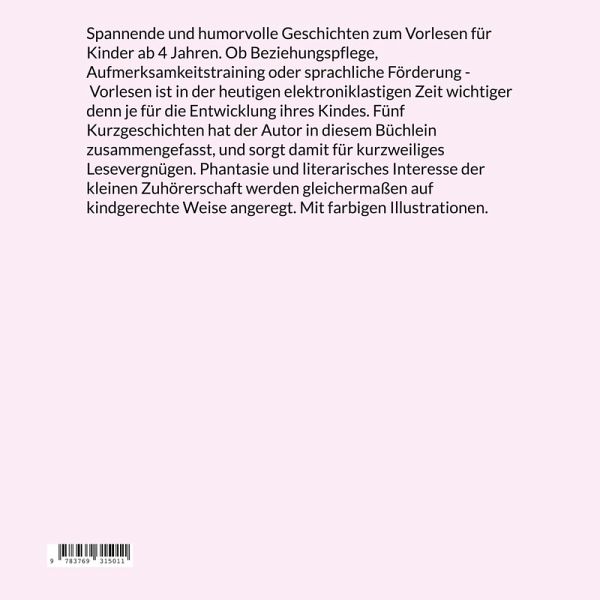 Spannende und humorvolle Geschichten zum Vorlesen für Kinder. Ob Beziehungspflege, Aufmerksamkeitstraining oder sprachliche Förderung - Vorlesen ist in der heutigen elektroniklastigen Zeit wichtiger denn je für die Entwicklung ihres Kindes. Dies ist dem Autor, der selbst Vater ist, nur allzu bewußt. Fünf seiner beliebten Kurzgeschichten hat er daher in diesem Büchlein zusammengefasst, und sorgt damit für kurzweiliges (Vor-) Lesevergnügen. Phantasie und literarisches Interesse der kleinen Zuhörerschaft werden gleichermaßen auf kindgerechte Weise angeregt. Mit farbigen Illustrationen von Olaf Biro.