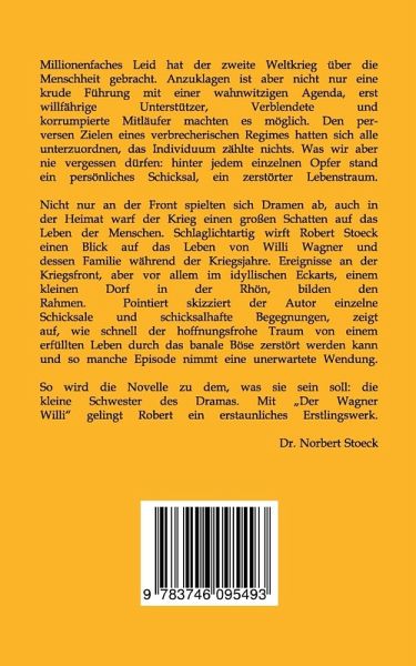 Millionenfaches Leid hat der zweite Weltkrieg über die Menschheit gebracht. Anzuklagen ist aber nicht nur eine krude Führung mit einer wahnwitzigen Agenda, erst willfährige Unterstützer, Verblendete und korrumpierte Mitläufer machten es möglich. Den perversen Zielen eines verbrecherischen Regimes hatten sich alle unterzuordnen, das Individuum zählte nichts. Was wir aber nie vergessen dürfen: hinter jedem einzelnen Opfer stand ein persönliches Schicksal, ein zerstörter Lebenstraum. Was noch schlimmer ist: Ein moralfreies Regime und ein sinnloser Krieg zwang junge Menschen im verständlichen Überlebensdrang dazu, eine Seite in sich hervorzukehren, die sie in Friedenszeiten vermutlich nie kennengelernt hätten. Wir, die wir nie einen Krieg erlebt haben und hoffentlich auch nie erleben werden, sollten uns nicht anmaßen, ein Urteil über ihr Handeln zu fällen. Nicht nur an der Front spielten sich Dramen ab, auch in der Heimat warf der Krieg einen großen Schatten auf das Leben der Menschen. Schlaglichtartig wirft Robert Stoeck einen Blick auf das Leben von Willi Wagner und dessen Familie während der Kriegsjahre. Ereignisse an der Kriegsfront, aber vor allem im idyllischen Eckarts, einem kleinen Dorf in der Rhön, abseits der großen Zentren, bilden den Rahmen. Es wäre möglich gewesen, die Protagonisten deutlicher auszuleuchten und die Geschehnisse, die sich so oder in ähnlicher Form tatsächlich hätten zutragen können, in epischer Breite zu schildern. Dieser Versuchung widersteht der Autor: pointiert skizziert er einzelne Schicksale und schicksalhafte Begegnungen, zeigt auf, wie schnell der hoffnungsfrohe Traum von einem erfüllten Leben durch das banale Böse zerstört werden kann und so manche Episode nimmt eine unerwartete Wendung.So wird die Novelle zu dem, was sie sein soll: die kleine Schwester des Dramas.Mit »Der Wagner Willi« gelingt Robert ein erstaunliches Erstlingswerk. Ich wünsche allen Lesern ein kurzweiliges Lesevergnügen und dem Werk die Anerkennung, die es verdient.Dr. Norbert Stoeck