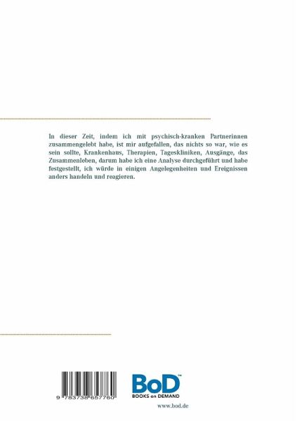 In dieser Zeit, in der ich mit einer psychisch-kranken Partnerin zusammengelebt habe, ist mir aufgefallen, das nichts so war, wie es sein sollte, Bezirkskrankenhaus, Therapien, Tageskliniken, Reha, das Zusammenleben, darum habe ich eine Analyse durchgeführt und habe festgestellt, ich würde heute in einigen Angelegenheiten und Ereignissen anders handeln und reagieren.