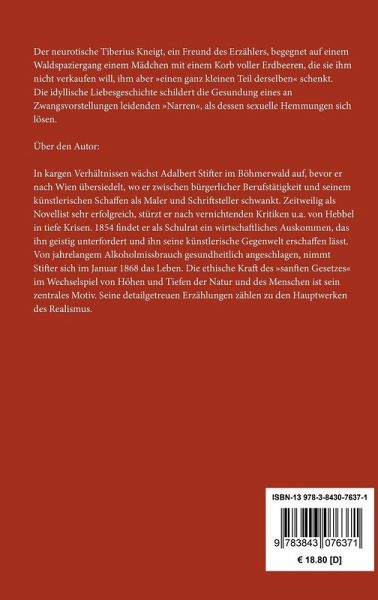 Adalbert Stifter: Der Waldsteig Der neurotische Tiberius Kneigt, ein Freund des Erzählers, begegnet auf einem Waldspaziergang einem Mädchen mit einem Korb voller Erdbeeren, die sie ihm nicht verkaufen will, ihm aber »einen ganz kleinen Teil derselben« schenkt. Die idyllische Liebesgeschichte schildert die Gesundung eines an Zwangsvorstellungen leidenden »Narren«, als dessen sexuelle Hemmungen sich lösen. Entstanden 1844, Erstdruck in: Oberösterreichisches Jahrbuch für Literatur und Landeskunde (Linz), 2. Jg., 1845. Vollständige Neuausgabe mit einer Biographie des Autors. Herausgegeben von Karl-Maria Guth. Berlin 2015. Textgrundlage ist die Ausgabe: Adelbert Stifter: Gesammelte Werke in sechs Bänden, [herausgegeben von Max Stefl,] Band 2, 6.¿10. Tausend der Gesamtausgabe, Wiesbaden: Insel, 1959. Die Paginierung obiger Ausgabe wird in dieser Neuausgabe als Marginalie zeilengenau mitgeführt. Umschlaggestaltung von Thomas Schultz-Overhage unter Verwendung des Bildes: Adriaen Coorte, Erdbeeren und Stachelbeeren, Ende des 17. Jahrhunderts. Gesetzt aus Minion Pro, 11 pt. Über den Autor: In kargen Verhältnissen wächst Adalbert Stifter im Böhmerwald auf, bevor er nach Wien übersiedelt, wo er zwischen bürgerlicher Berufstätigkeit und seinem künstlerischen Schaffen als Maler und Schriftsteller schwankt. Zeitweilig als Novellist sehr erfolgreich, stürzt er nach vernichtenden Kritiken u.a. von Hebbel in tiefe Krisen. 1854 findet er als Schulrat ein wirtschaftliches Auskommen, das ihn geistig unterfordert und ihn seine künstlerische Gegenwelt erschaffen lässt. Von jahrelangem Alkoholmissbrauch gesundheitlich angeschlagen, nimmt Stifter sich im Januar 1868 das Leben. Die ethische Kraft des »sanften Gesetzes« im Wechselspiel von Höhen und Tiefen der Natur und des Menschen ist sein zentrales Motiv. Seine detailgetreuen Erzählungen zählen zu den Hauptwerken des Realismus.