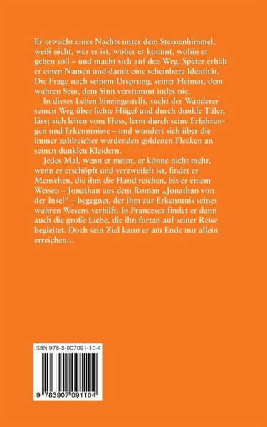 Er erwacht eines Nachts unter dem Sternenhimmel, weiß nicht, wer er ist, woher er kommt, wohin er gehen soll - und macht sich auf den Weg. Später erhält er einen Namen und damit eine scheinbare Identität. Die Frage nach seinem Ursprung, seiner Heimat, dem wahren Sein, dem Sinn verstummt indes nie. In dieses Leben hineingestellt, sucht der Wanderer seinen Weg über lichte Hügel und durch dunkle Täler, lässt sich leiten vom Fluss, lernt durch seine Erfahrungen und Erkenntnisse - und wundert sich über die immer zahlreicher werdenden goldenen Flecken an seinen dunklen Kleidern. Jedes Mal, wenn er meint, er könne nicht mehr, wenn er erschöpft und verzweifelt ist, findet er Menschen, die ihm die Hand reichen, bis er einem Weisen - Jonathan aus dem Roman "Jonathan von der Insel" - begegnet, der ihm zur Erkenntnis seines wahren Wesens verhilft. In Francesca findet er dann auch die große Liebe, die ihn fortan auf seiner Reise begleitet. Doch sein Ziel kann er am Ende nur allein erreichen ...