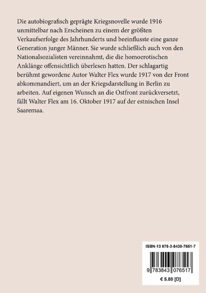 Walter Flex: Der Wanderer zwischen beiden Welten Die autobiografisch geprägte Kriegsnovelle wurde 1916 unmittelbar nach Erscheinen zu einem der größten Verkaufserfolge des Jahrhunderts und beeinflusste eine ganze Generation junger Männer. Sie wurde schließlich auch von den Nationalsozialisten vereinnahmt, die die homoerotischen Anklänge offensichtlich überlesen hatten. Der schlagartig berühmt gewordene Autor Walter Flex wurde 1917 von der Front abkommandiert, um an der Kriegsdarstellung in Berlin zu arbeiten. Auf eigenen Wunsch an die Ostfront zurückversetzt, fällt Walter Flex am 16. Oktober 1917 auf der estnischen Insel Saaremaa. Entstanden: 1915¿1916. Erstdruck: München (Beck) 1916. Vollständige Neuausgabe mit einer Biographie des Autors. Herausgegeben von Karl-Maria Guth. Berlin 2015. Textgrundlage ist die Ausgabe: Walter Flex: Der Wanderer zwischen beiden Welten. Ein Kriegserlebnis, in: Walter Flex. Gesammelte Werke, Band 1, vierte erweiterte Aufl., 16. bis 20. Tausend, München: Beck, [o. J.], S. 185¿265. Die Paginierung obiger Ausgabe wird in dieser Neuausgabe als Marginalie zeilengenau mitgeführt. Umschlaggestaltung von Thomas Schultz-Overhage. Gesetzt aus Minion Pro, 11 pt.