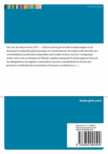 Studienarbeit aus dem Jahr 2005 im Fachbereich Geschichte Europa - Deutschland - 1848, Kaiserreich, Imperialismus, Note: 2, Friedrich-Schiller-Universität Jena, Sprache: Deutsch, Abstract: Die Zeit des Kaiserreichs (1871 1918) ist durch gravierende Veränderungen in der deutschen Gesellschaft gekennzeichnet. Es transformieren sich nahezu alle Bereiche des wirtschaftlichen, politischen, kulturellen und sozialen Lebens. Ziel der vorliegenden Arbeit soll es sein, am Beispiel der Wandervogelbewegung, die Veränderungen im Bereich des Alltagslebens der Jugend zu beleuchten, um diese anschließend im System der gesamten Gesellschaft des betrachteten Zeitraums zu lokalisieren. Hierzu sollen im ersten Teil die ausschlaggebenden Veränderungsprozesse (Industrialisierung, Bevölkerung, Sektoren der Arbeit) beleuchtet werden, um einen Überblick über den Zustand der Gesellschaft im Kaiserreich zu bekommen. Anschließend soll der Blick auf die sozialen Bewegungen gelenkt werden, angefangen bei den kleinsten sozialen Einheiten (Familie, Gemeinde, Schule) und endend mit den organisierten Jugendbewegungen. Der Hauptteil der Analyse fällt der ausführlichen Untersuchung des Wandervogels zu, wobei die ausschlaggebenden Fragewörter WER, WAS, WO, WARUM und WIE sein werden. Hier sollen auch die anderen Jugendorganisationen der betrachteten Zeitperiode in die Analyse miteinbezogen werden. Letztendlich soll auf die Bedeutung und die Auswirkungen des Wandervogels eingegangen werden, wobei die Begriffe Jugend , Organisation und Politik eine Rolle spielen werden.