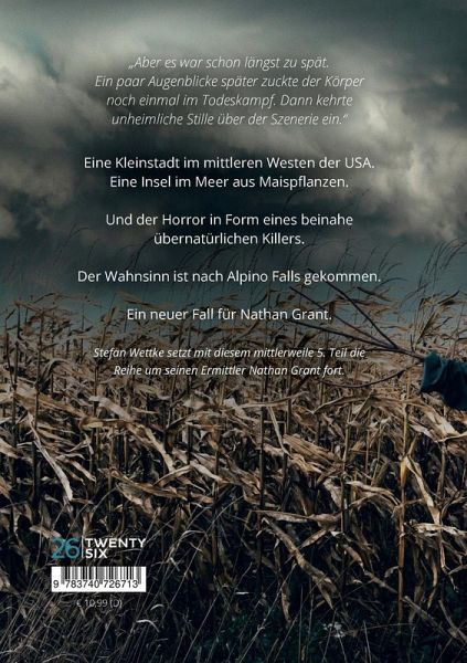 Eine Kleinstadt im mittleren Westen der USA. Eine Insel im Meer aus Maispflanzen. Und der Horror in Form eines beinahe übernatürlichen Killers. Der Wahnsinn ist nach Alpino Falls gekommen. Ein neuer Fall für Nathan Grant. Stefan Wettke setzt mit diesem mittlerweile 5. Teil die Reihe um seinen Ermittler Nathan Grant fort.