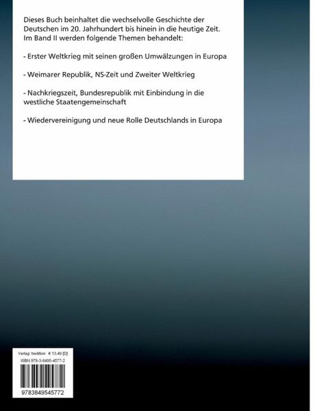Im Band II werden folgende Themen behandelt:- Erster Weltkrieg mit seinen großen Umwälzungen in Europa- Weimarer Republik, NS-Zeit und Zweiter Weltkrieg - Nachkriegszeit, Bundesrepublik mit Einbindung in die westliche Staatengemeinschaft- Wiedervereinigung und neue Rolle Deutschlands in Europa