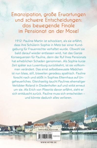 Personifiziert werden sie durch Pauline, der Leiterin und Lehrerin des Pensionats an der Mosel als Lothringerin…mehrWie die Autorin stamme auch ich aus der Grenzregion Saarland/Lothringen/Luxemburg/Elsass, deren Historie oftmals durch Kriege und Weltkriege eine Besondere war. (Das Elsass, Lothringen wie auch das Saarland gehörten zum einen Frankreich, zum anderen Deutschland an in der Vergangenheit). Personifiziert werden sie durch Pauline, der Leiterin und Lehrerin des Pensionats an der Mosel als Lothringerin aus Metz; durch den preußischen Offizier Erich von Pliesnitz, der im Grunde wenig von Frauen hält (was mit dessen eigener Geschichte sehr viel zu tun hat) und der dennoch großen Respekt und auch tiefere Gefühle für Pauline hegt, die ihm mit ihrer Geradlinigkeit, ihrer Intelligenz und auch ihrem Mut, den eigenen Weg zu gehen und sich über gesellschaftliche Konventionen hinwegzusetzen und Probleme möglichst eigenständig zu lösen, sehr imponiert, er sehr von ihr angetan ist. Desweiteren treffen wir den Gärtner und früheren (schuldlos in Haft geratenen) Sträfling Vincent wieder, der an Haus und Garten der Schule nach dem Rechten guckt und ein Auge auf Camille, das Stubenmädchen geworfen hat, das ihrerseits eine eigene Geschichte mitbringt. Die Schülerinnen; besonders Ernestine, die später einmal Journalistin werden will, Brunhilde, die für ihr Leben gerne liest, zwei Schwestern, die später ein Restaurant eröffnen wollen und andere mehr treffen wir in diesem Schuljahr, in dem einige ihren Abschluss machen werden, wieder.