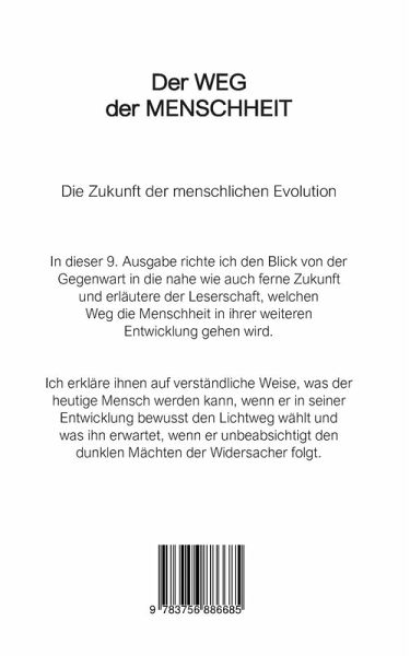 In dieser 9. und letzten Ausgabe der Buchserie Geistiges Wissen richtet der Autor den Blick von der Gegenwart in die nahe wie auch ferne Zukunft und erläutert der Leserschaft in chronologischer Form, welchen Weg die Menschheit in ihrer weiteren Entwicklung gehen wird.Er erklärt auf verständliche Weise, was der heutige Mensch werden kann, wenn er in seiner Entwicklung bewusst den Lichtweg wählt und was ihn erwartet, wenn er unbeabsichtigt den dunklen Mächten der Widersacher Luzifer und Ahriman folgt.