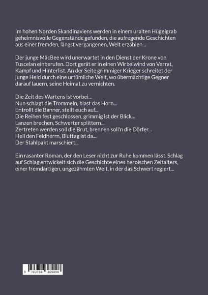 Im hohen Norden Skandinaviens werden in einem uralten Hügelgrab geheimnisvolle Gegenstände gefunden, die aufregende Geschichten aus einer fremden, längst vergangenen, Welt erzählen...Der junge MäcBee wird unerwartet in den Dienst der Krone von Tuscelan einberufen. Dort gerät er in einen Wirbelwind von Verrat, Kampf und Hinterlist. An der Seite grimmiger Krieger schreitet der junge Held durch eine urtümliche Welt, wo übermächtige Gegner darauf lauern, seine Heimat zu vernichten.Die Zeit des Wartens ist vorbei...Nun schlagt die Trommeln, blast das Horn...Entrollt die Banner, stellt euch auf...Die Reihen fest geschlossen, grimmig ist der Blick...Lanzen brechen, Schwerter splittern...Zertreten werden soll die Brut, brennen soll'n die Dörfer...Heil den Feldherrn, Bluttag ist da...Der Stahlpakt marschiert...Ein rasanter Roman, der den Leser nicht zur Ruhe kommen lässt. Schlag auf Schlag entwickelt sich die Geschichte eines heroischen Zeitalters, einer fremdartigen, ungezähmten Welt, inder das Schwert regiert...