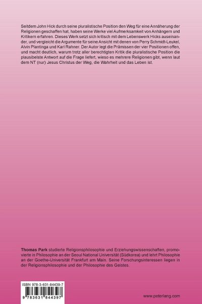 Seitdem John Hick durch seine pluralistische Position den Weg für eine Annäherung der Religionen geschaffen hat, haben seine Werke viel Aufmerksamkeit von Anhängern und Kritikern erfahren. Dieses Werk setzt sich kritisch mit dem Lebenswerk Hicks auseinander, und vergleicht die Argumente für seine Ansicht mit denen von Perry Schmidt-Leukel, Alvin Plantinga und Karl Rahner. Der Autor legt die Prämissen der vier Positionen offen, und macht deutlich, warum trotz aller berechtigten Kritik die pluralistische Position die plausibelste Antwort auf die Frage liefert, wieso es mehrere Religionen gibt, wenn laut dem NT (nur) Jesus Christus der Weg, die Wahrheit und das Leben ist.