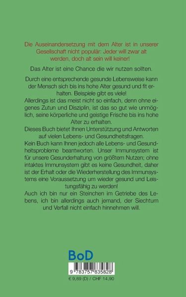 Bleiben Sie gesund und fit bis ins hohe Alter! Jeder möchte alt werden, aber keiner möchte alt sein - doch das Alter bietet Chancen, die wir nutzen sollten. Mit der richtigen Lebensweise können wir unsere Gesundheit und Fitness bis ins hohe Alter bewahren. Dieses Buch zeigt Ihnen, wie es geht! Viele Menschen haben bewiesen, dass ein gesunder Lebensstil zu einem langen und erfüllten Leben führen kann. Doch ohne Eigeninitiative und Disziplin ist es schwierig, körperliche und geistige Frische zu erhalten. Hier setzt dieser Ratgeber an und bietet Ihnen umfassende Unterstützung und Antworten auf zahlreiche Lebens- und Gesundheitsfragen. Dieses Buch kann nicht alle Probleme lösen, aber es vermittelt Ihnen wertvolles Wissen über die Bedeutung eines starken Immunsystems. Ohne ein intaktes Immunsystem ist Gesundheit nicht möglich. Erfahren Sie, wie Sie Ihr Immunsystem erhalten oder wiederherstellen können, um gesund und leistungsfähig zu bleiben. Wir müssen Siechtum und Verfall im Alter nicht einfach hinnehmen. Lassen Sie uns gemeinsam Wege finden, um das Leben bis ins hohe Alter aktiv und gesund zu gestalten!